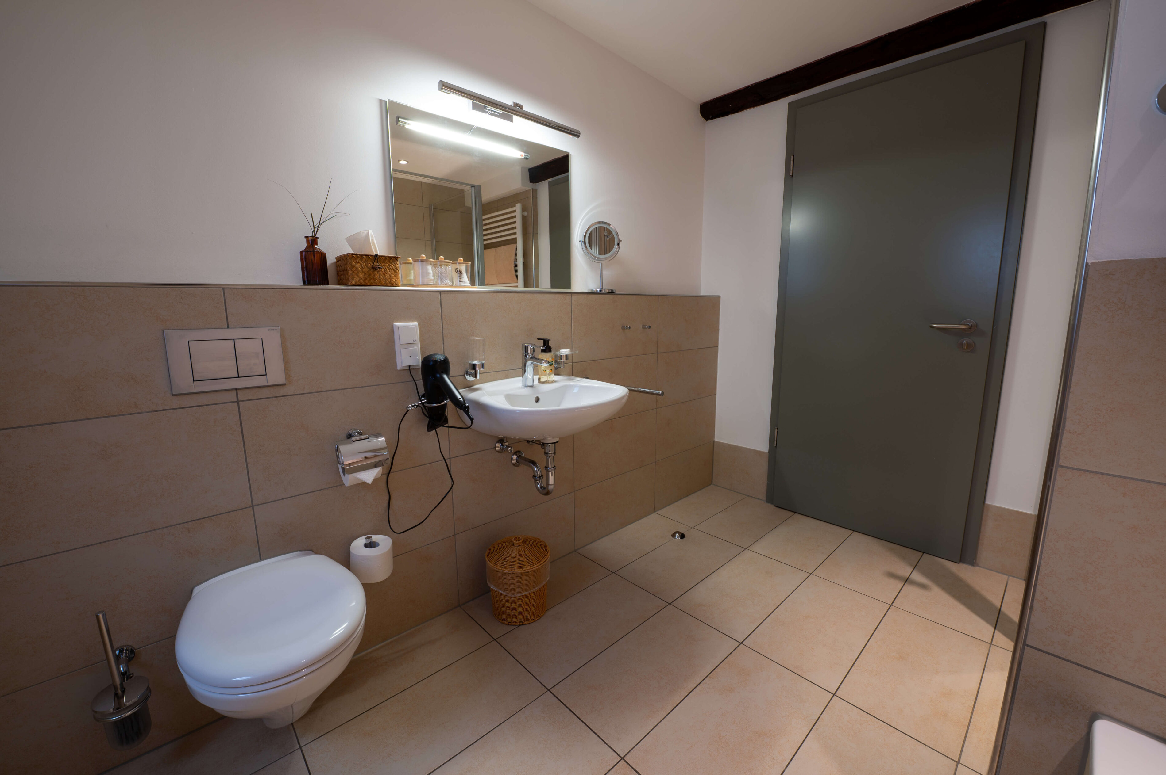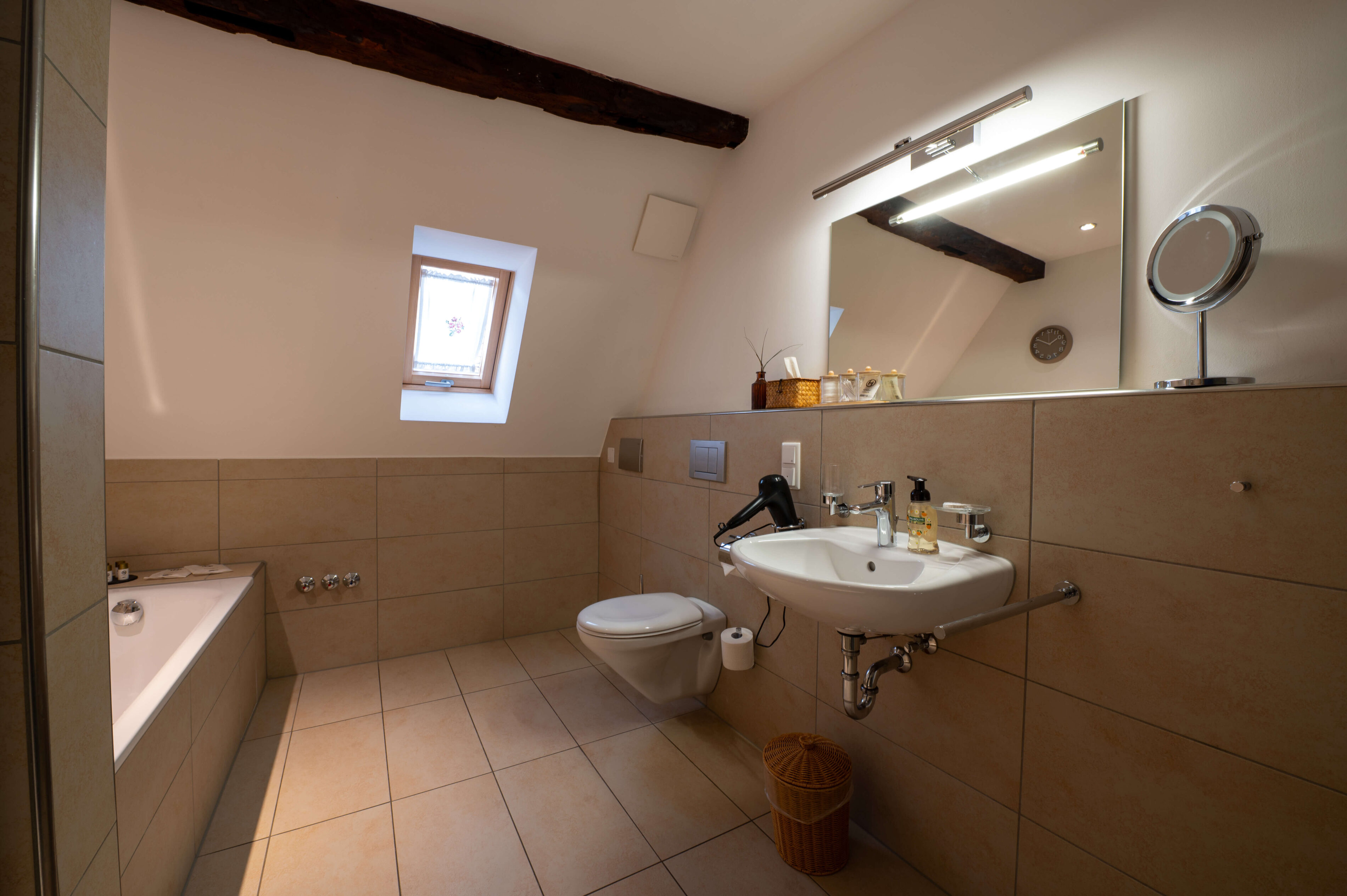 • Großzügiges Badezimmer mit Dusche und Badewanne, Fön
